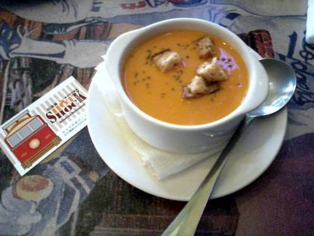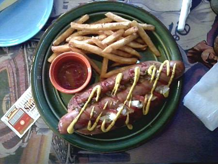 濃湯先來~~~是南瓜湯~~~有熱而且上面有灑麵包丁~很鮮甜的湯~~湯做的還不錯~~~之後我的煙燻熱狗上桌~~~很大一份~~~真的很大~~~是那種傳統口味的熱狗[蕃茄醬+黃芥末~~~以及撒滿酸黃瓜~]旁邊有附脆薯~薯條沒冷掉~~~炸的不油膩好吃~~~
