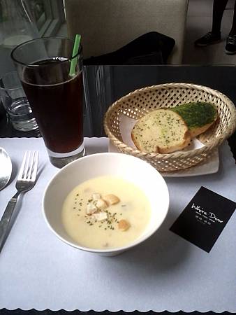 我點青醬蛤蜊義大利麵200元+79元套餐價[有附飲料~麵包和濃湯]~~在比較沒那麼熟的店~~基本上都是點安全牌為主~~~等餐空檔~懷特朵兒的正妹服務生服務還算不錯~~~都有在注意每桌的狀況~