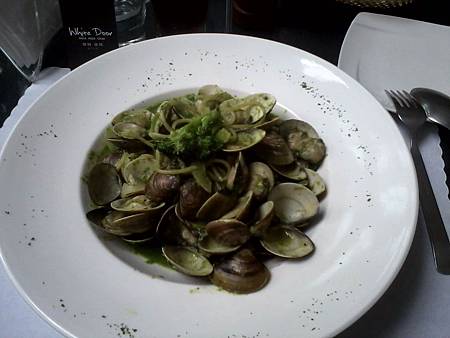 青醬蛤蜊義大利麵沒多久也上桌了~~這盤的蛤蜊有下重本~~~年青人吃遍台中各地的蛤蜊麵~懷特朵兒的蛤蜊是我吃過的義麵店給的最多了~光是蛤蜊殼就有小山般高~~~除了蛤蜊多這盤的青醬調味也是年青人喜歡的~~~不過蛤蜊多歸多~~~義大利麵的份量我覺得蠻少的~~以女生來說應該是夠了~但男生可能有點不太夠~~~結果最後都變吃蛤蜊~~~因為麵一下就被我掃完了~~