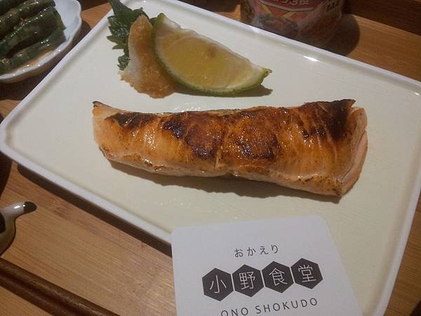 接著我的鮭魚定食在沒有等很久的情況下送上桌了~~小野的鮭魚煎的非常不錯~~而且味道非常好吃~~老闆娘說他們都是用當天買來的鮭魚下去做料理的~~這天年青人很幸運剛好是第一位享用這新鮮鮭魚的客人~哈哈~~鮭魚除了單吃很鮮美外~~也可以加附贈的蘿蔔泥~檸檬和胡椒鹽下去一起吃~~年青人最推的是沾蘿蔔泥和胡椒鹽的吃法~~