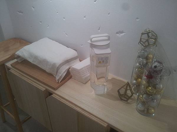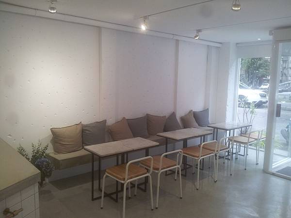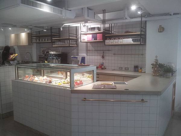 原本我以為這家會跟其他甜點店一樣~~會有很多乾燥花做裝飾~~不過當進到店內後~~這家店內的牆面和門面一樣都是以白色系為主~就連櫃台也是用白色的磁磚來做拼貼~~這樣極簡式的裝潢風格~~讓人感覺在視覺上乾淨許多~~也讓年青人不會因為過多的乾燥花弄得心浮氣躁~~